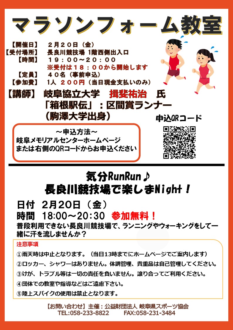 2月20日(金)「気分RUNRUN♪長良川競技場で楽しまnight!!」同時開催「マラソンフォーム教室」