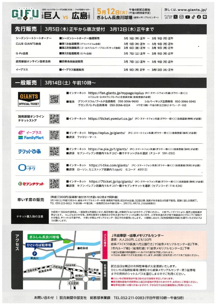 5月12日(火)JERAセントラルリーグ公式戦2026 巨人対広島のチケット販売に関しまして